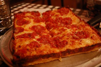 Pizza place in north new hyde park, new york. 18 round, 8 slices cheese & tomato sauce, baked well done. Pizzerior i new hyde park, new york: